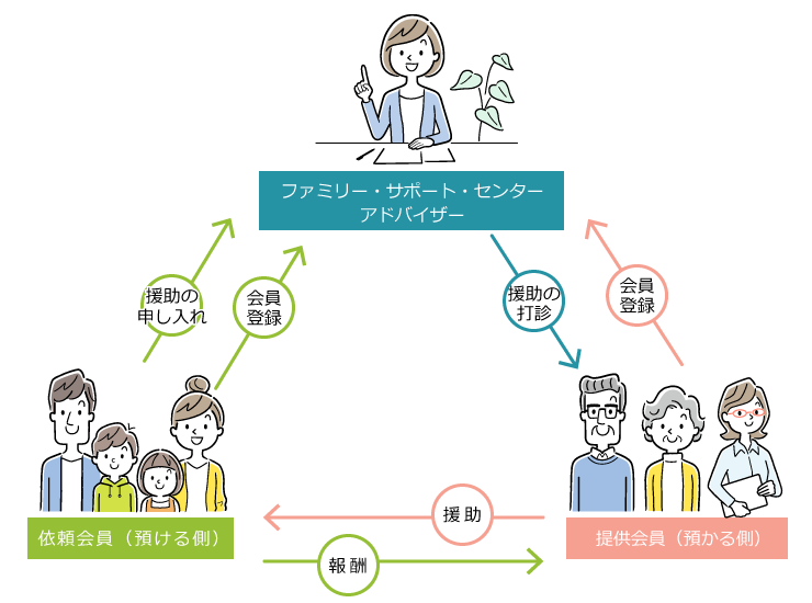 おねがい会員・おたすけ会員・センター事務局の3者が協力して、お子さんの成長を見守り育んでいきましょう。